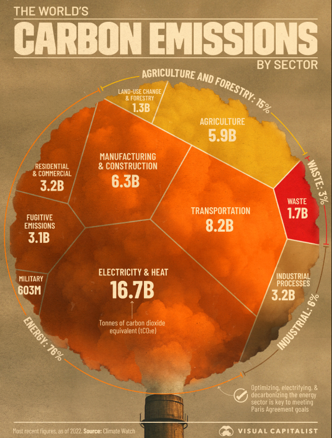 - Following shows the world’s carbon emissions by sector. Energy related are the biggest source. Followed by Agriculture, Industrial Processes and Waste.